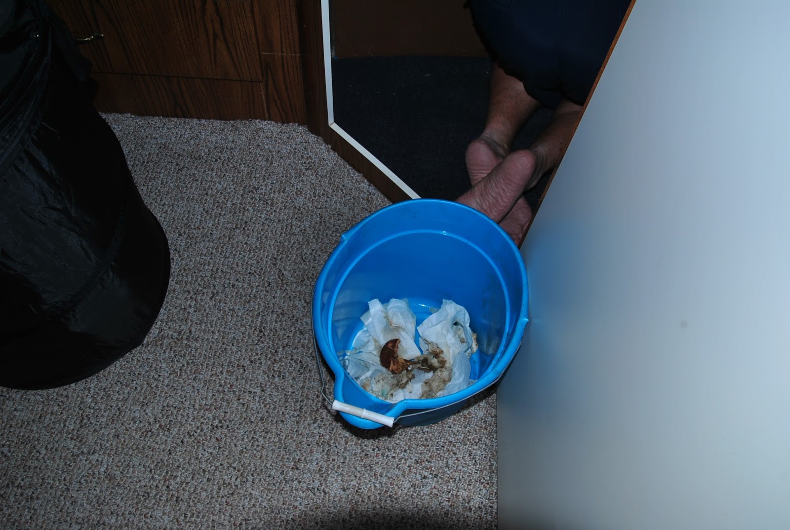 Okay now comes some unpleasantries, as we have said before boating is not all cocktails and sunsets, although we have enjoyed many a sunsets, but this time we had head problems and I am not talking the one on our shoulders. So yes I am going to share this part of our life too. That morning in Midland we had pumped the holding tank out. It was free with a fuel purchase, which we had made. Later that day I had gone to the head and notice there was a different smell than what usually came from the head. Those that own boats with heads understand what I am referring to. Now Mike has accused me of having a nose like a blood hound, which I must admit I do, but this one was just different and I couldn’t figure out why. So after being thrashed around in the bay and finally getting settled I told Mike we needed to figure out what was going on with the head. Well guess what folks we figured it out. Mike brings out to me two zip lock bags that have our prescription drugs in them. I had the forethought to put many of the bathroom articles in zip lock bags mostly because of moisture issues. He said there is this brown stuff on them that looks like saw dust, well I knew right away it wasn’t saw dust, yes you guessed it. After freaking out just a bit, we took everything out from under the sink and behind the head. My job was to clean up the stuff and Mike’s job was to find out where the leak was. We located the leak in an elbow joint where the so called black water comes from the holding tank to the outside receptacle. I won’t go into to much detail other than to say IT WAS GROSS!!! Everything had to be cleaned inside and out (which Mike took care of) and then he rejoined the pvc pipe and we prayed it would hold. We will find out next time we go to pump out. Now remember while all this is going on we have no electric and it is storming out. At the same time I am discovering that we have several leaking ports (windows) so I am going around laying out plastic bags with towels on them. Oh yes this is the life of a cruisers. That evening was pretty stressful and I must admit the first mate had a bit of a melt down. But oh what a difference a day can make.